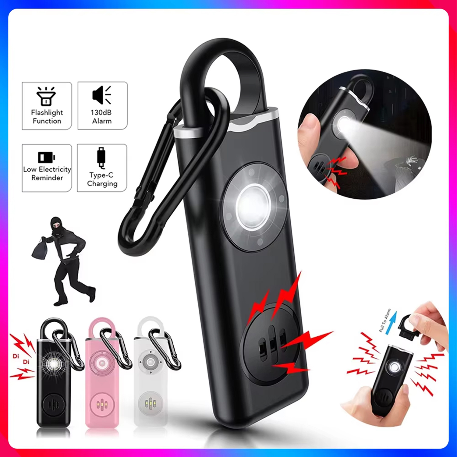 Both the 130dB siren and bright LED strobe activate simultaneously with one button press. This combination creates both auditory and visual alerts for maximum effectiveness in disorienting threats.