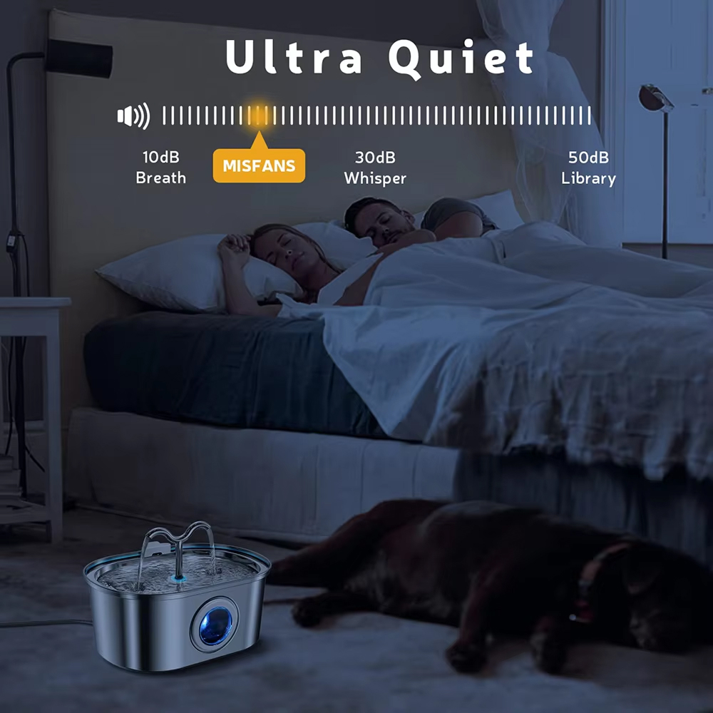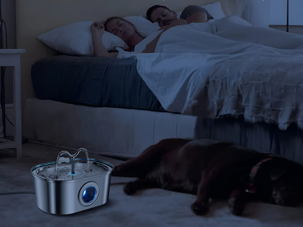 No, the ultra-quiet 1.5W pump operates below 20dB, quieter than a whisper, ensuring undisturbed sleep for both you and your pets throughout the night.